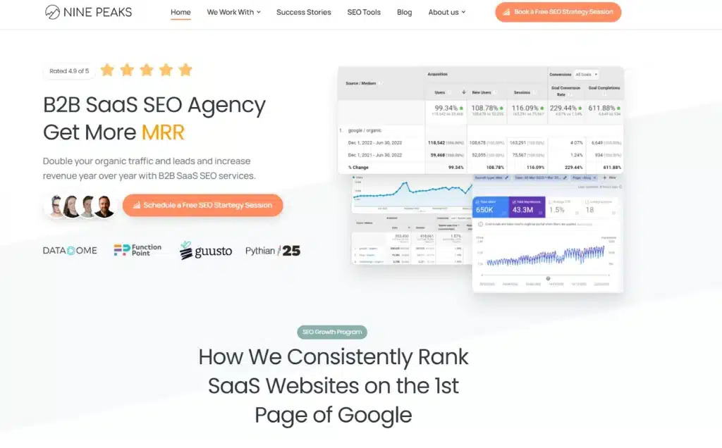 Nine Peaks is a Toronto-based B2B SEO agency that has specialized in helping SaaS, tech, and software companies reach first-page Google rankings since 2009. They focus on performance-driven results through their comprehensive SEO Growth Program, helping over 60 companies scale to 7-figure revenues with organic search as their primary lead generation channel.