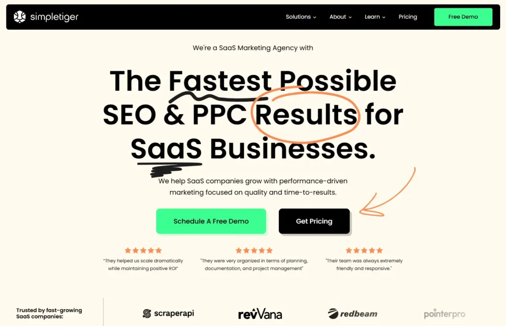 SimpleTiger is a SaaS-focused marketing agency with 15+ years of experience helping companies drive predictable growth through organic search. They position themselves as specialists in turning SEO into a revenue driver, not just a traffic source, using proprietary AI technology and proven playbooks to accelerate typically slow SEO processes.